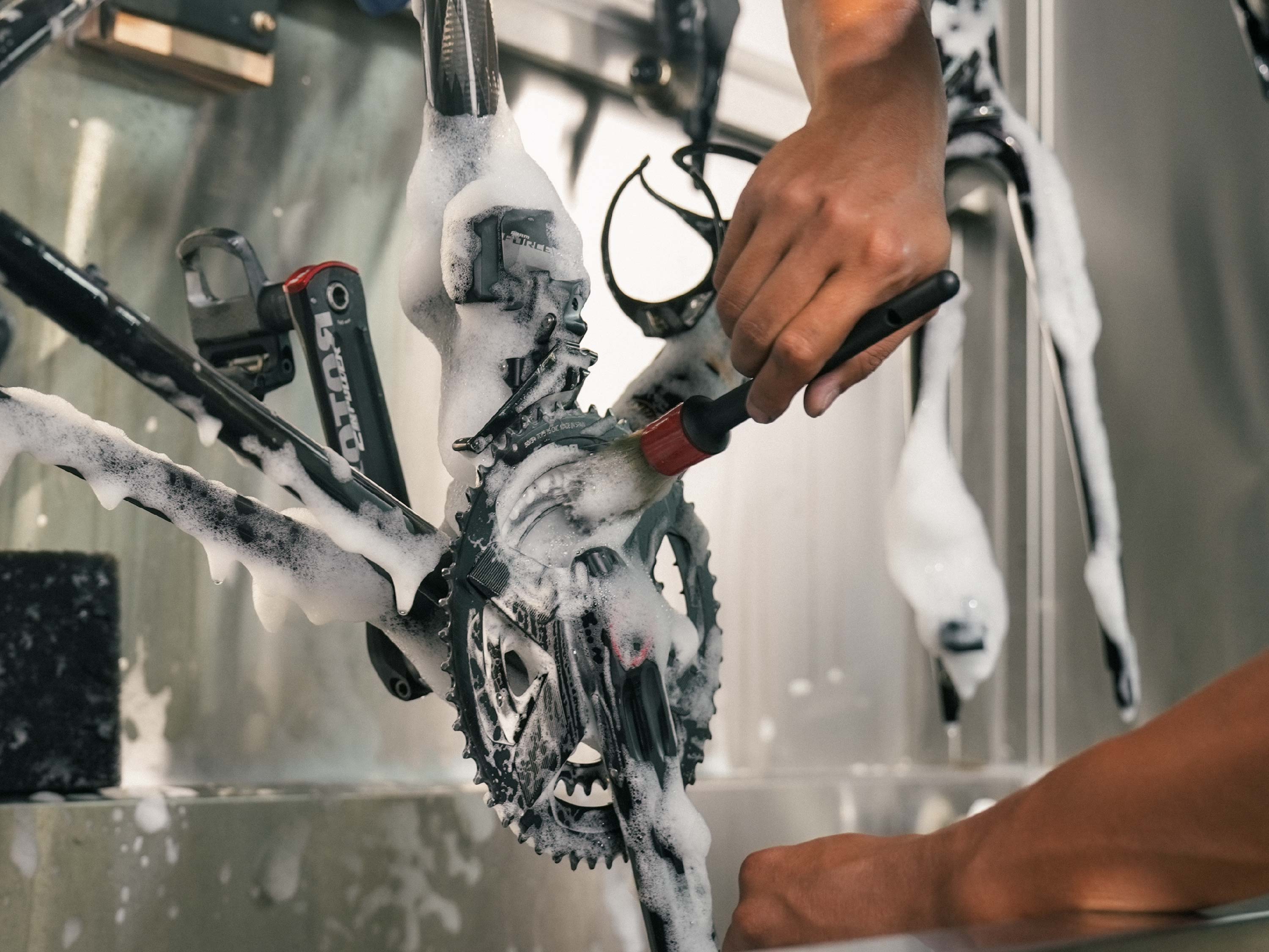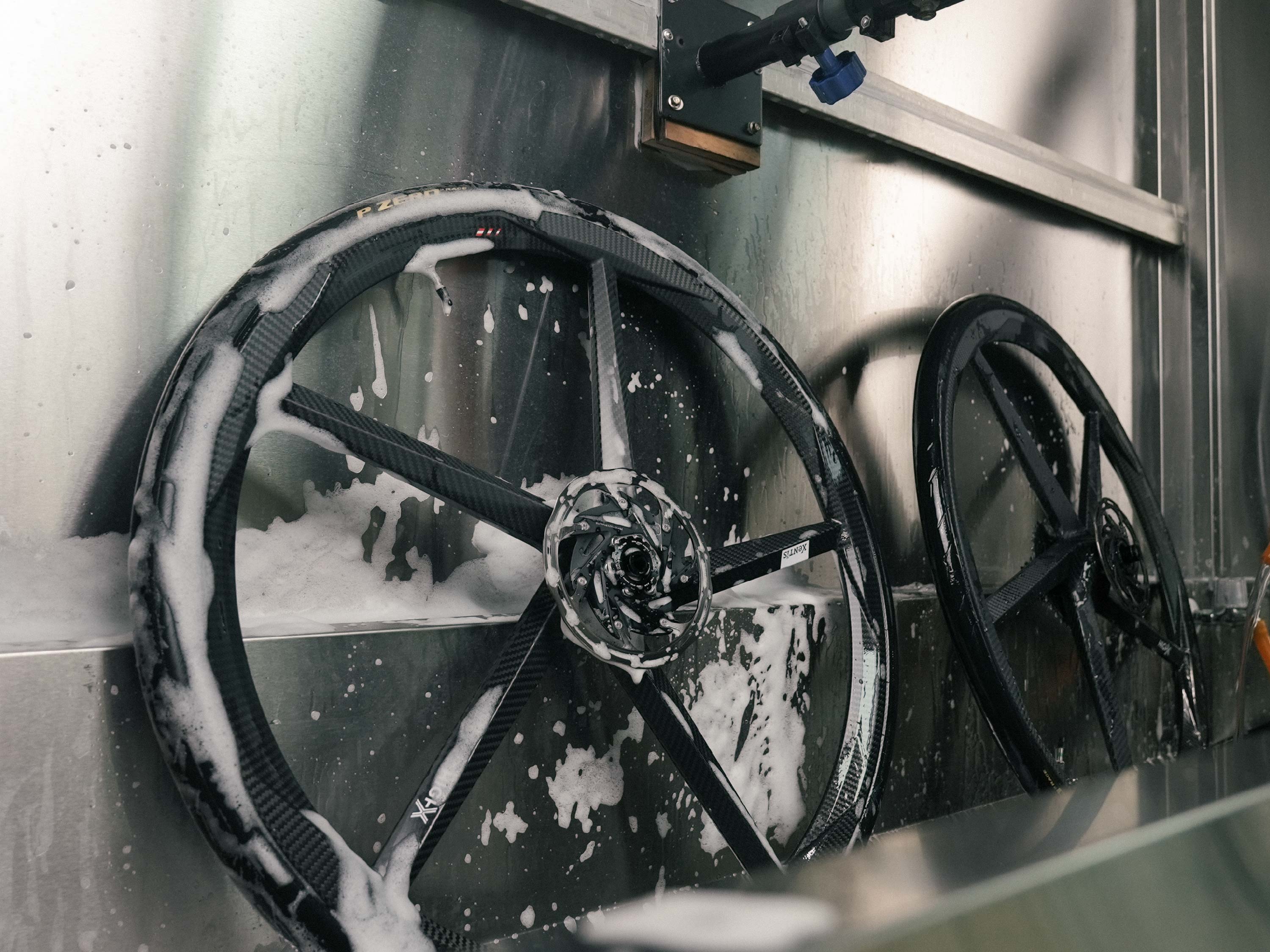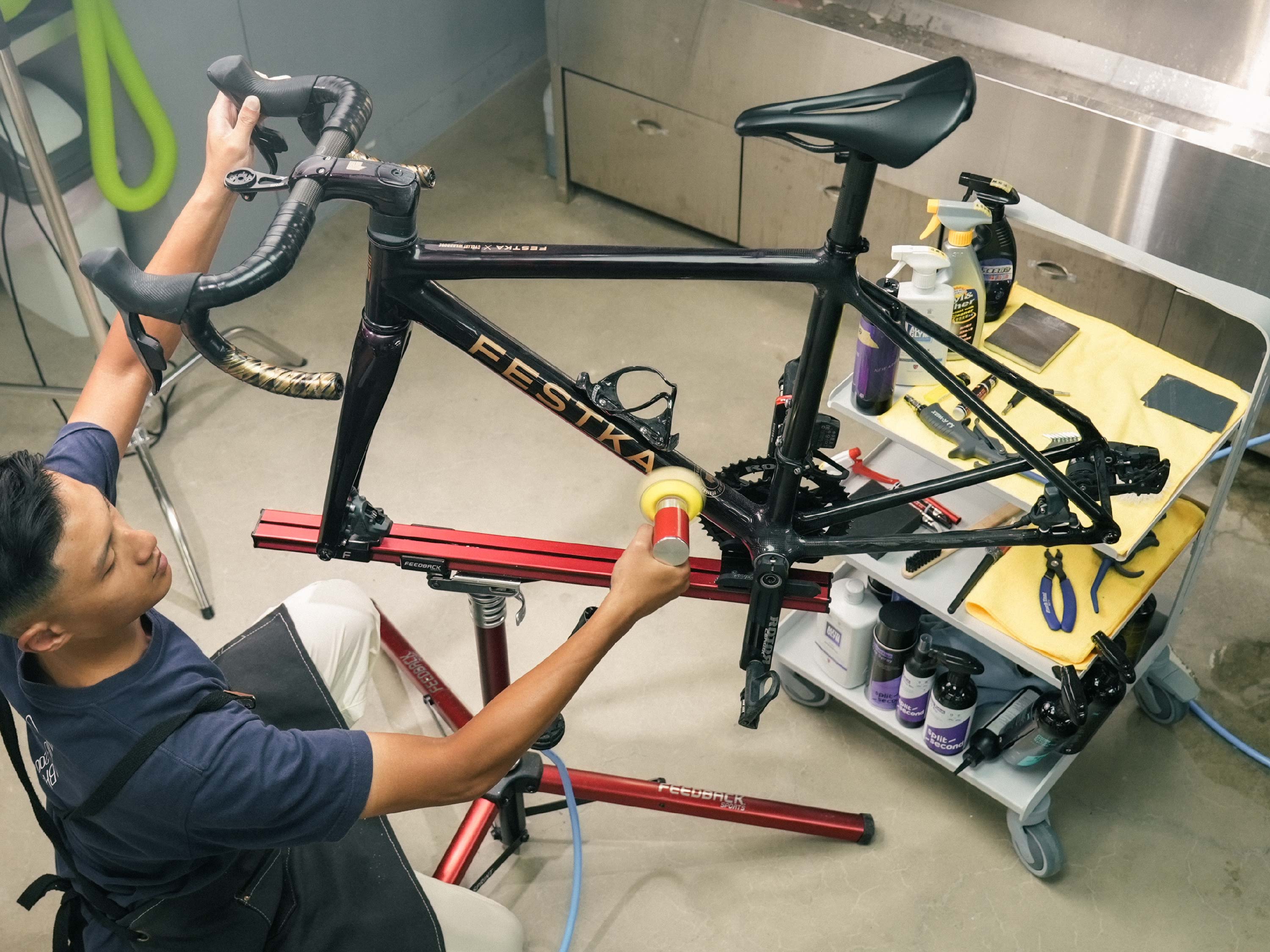 在洗淨車身、變速器還有輪組之後,採用無水無油的醫療等級風槍吹乾細部,用心擦拭拆卸的各式零件及輪組,車架拋光傷痕處理,最後才會是侍蠟保養。